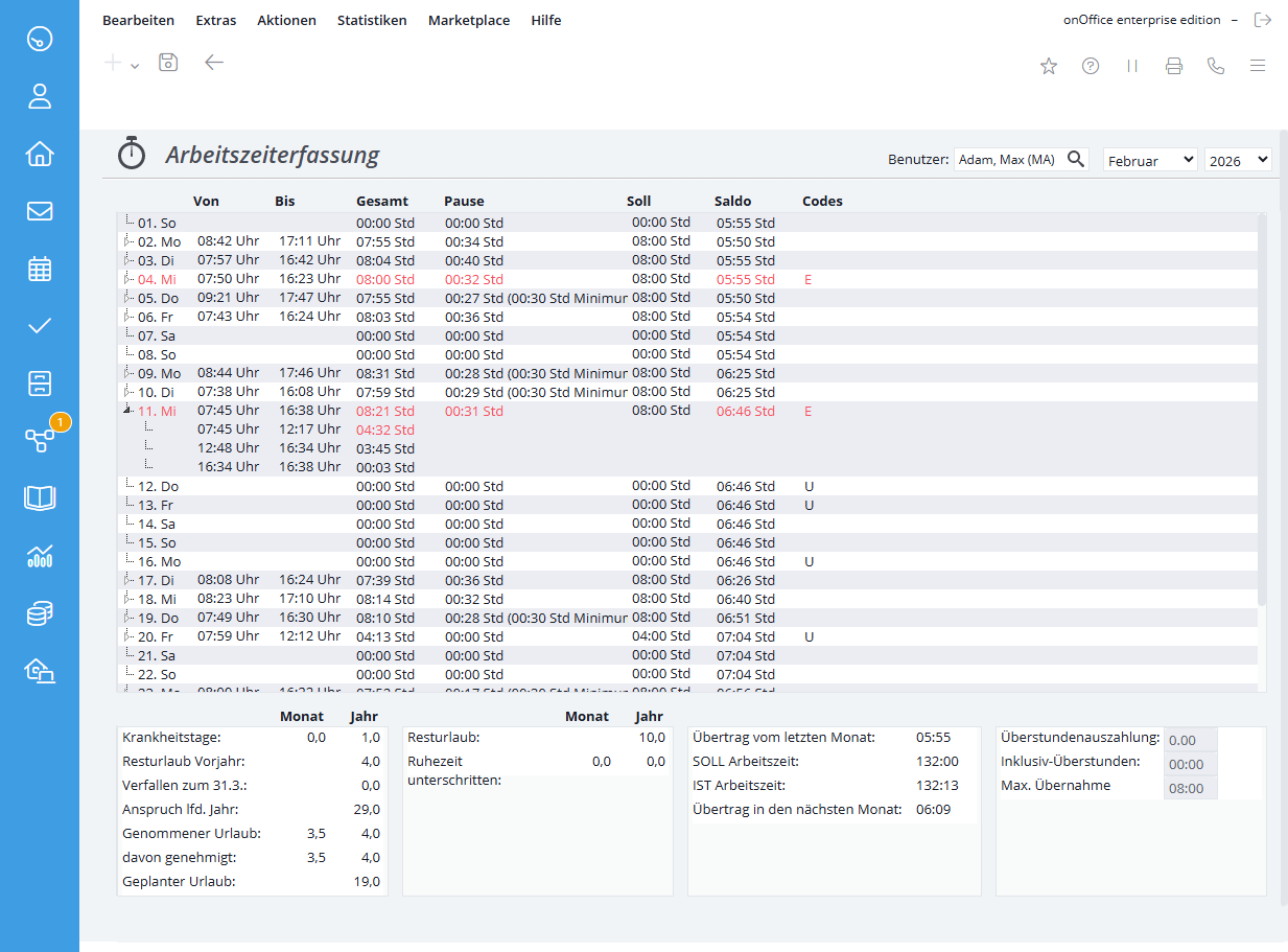 Il modulo Tracciamento dell’orario di lavoro ti consente di documentare le ore di lavoro dei tuoi collaboratori in modo semplice e diretto all’interno di onOffice enterprise. Automatizza la gestione delle ferie e, grazie al collegamento con compiti e appuntamenti, offre possibilità di analisi dettagliate.