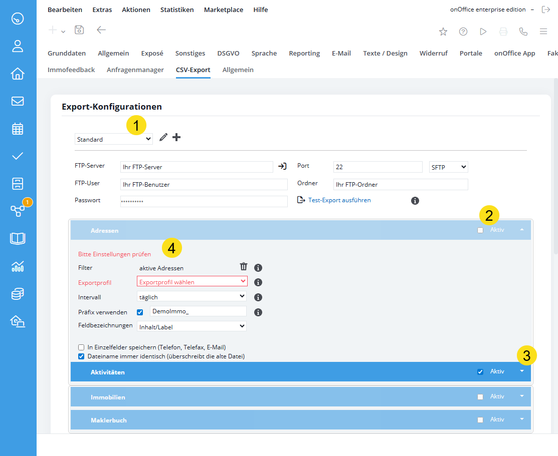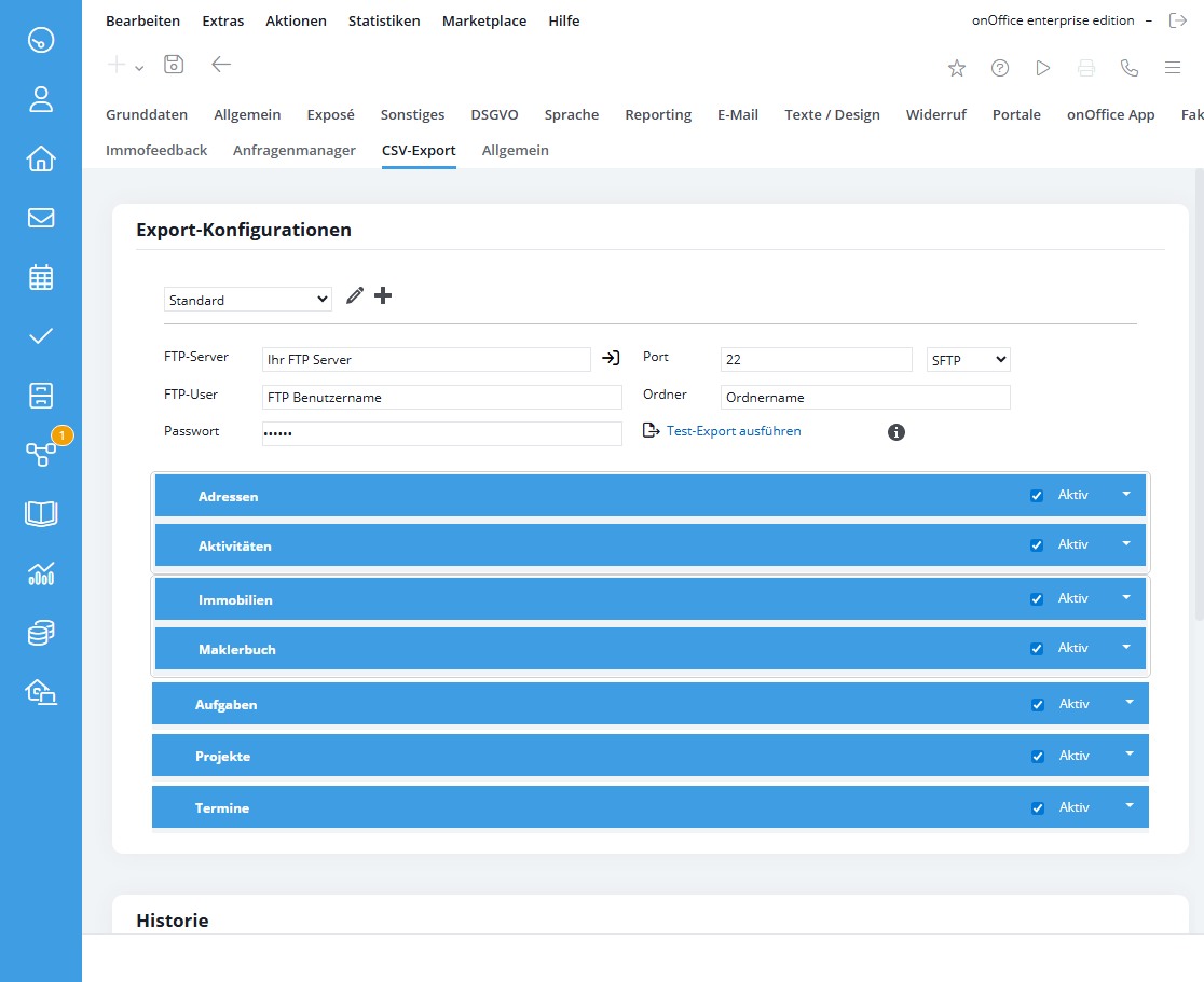 Mit dem Automatischen CSV-Export können Sie Datensätze aus Adressen, Immobilien, Aktivitäten und Maklerbucheinträgen, Aufgaben, Projekten und Terminen auf einen FTP-Server exportieren. Die Konfiguration finden Sie unter Extras → Einstellungen → Grundeinstellungen → Automatisierung → Unterreiter Automatischer CSV-Export .Schlägt ein Export fehl, wird für die entsprechende Konfiguration der automatische Export deaktiviert und der technische Ansprechpartner per E-Mail informiert.
