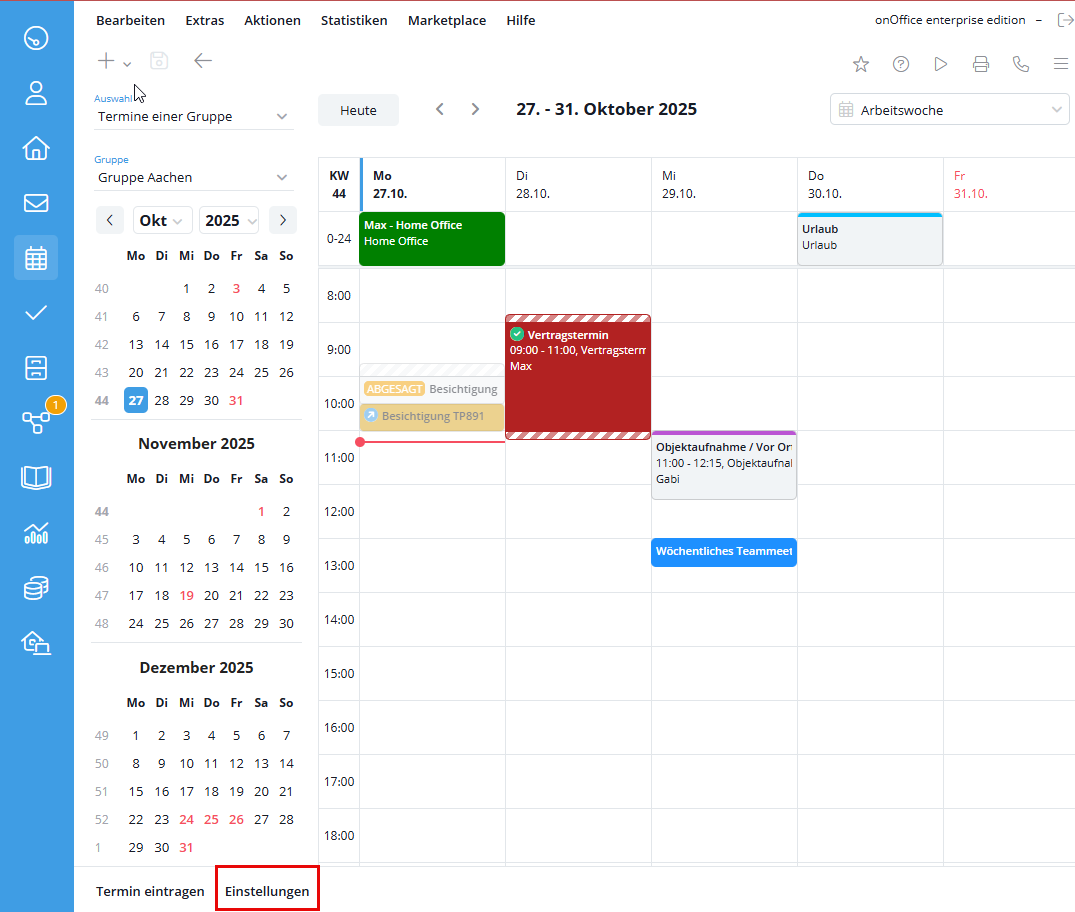 En la barra de acciones de la vista general de citas encontrará, entre otras cosas, los ajustes de la vista de calendario. Puedes imprimir un resumen de sus citas a través del icono de la impresora en la barra de herramientas.