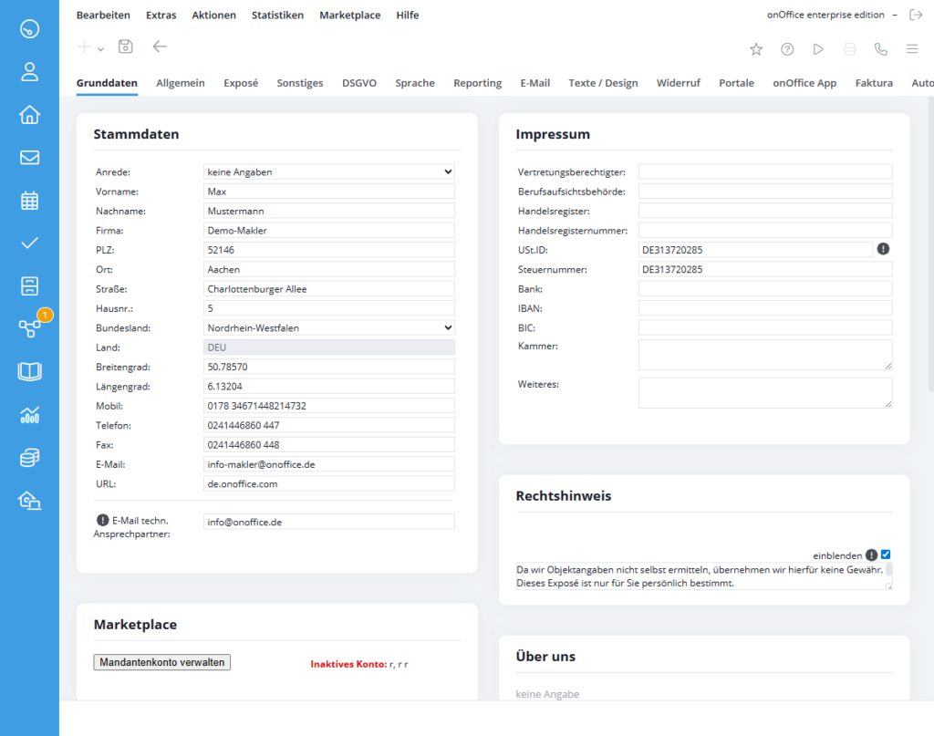Si, por ejemplo, no se utiliza ninguna persona de contacto para un inmueble, los datos de contacto de los datos básicos se indican en los exposés o se transfieren al portal.