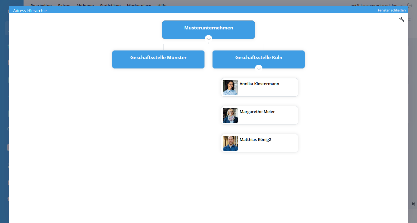La vista jerárquica es una herramienta importante para representar gráficamente toda la estructura de la empresa de un vistazo. La vista jerárquica se puede llamar desde cualquier contacto que tenga al menos un contacto/nivel superior o subordinado. La vista se puede abrir a través del icono en la barra de información del contacto correspondiente. Las ramas individuales se pueden plegar por separado. La imagen de portada del contacto se utiliza como imagen para las personas físicas.