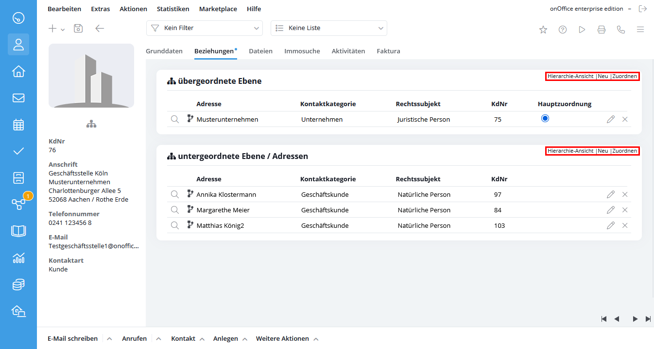En los contactos de la entidad legal «persona jurídica» o «asociación», solo se muestran las relaciones jerárquicas «nivel superior» y «nivel subordinado / contactos». A través de los nuevos cuadros de relación, se puede abrir la vista de jerarquía, crear nuevos contactos y asignar los existentes.