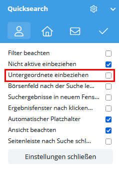 Si activas la categoría de contactos para la búsqueda rápida, hay una opción adicional «Incluir subordinados» en los ajustes. Así, si seleccionas una categoría de contacto y también hace una entrada en uno de los campos de búsqueda, los contactos subordinados también se mostrarán en los aciertos de la búsqueda en la lista de resultados. Por ejemplo, no solo se encuentran las empresas, sino también todos los empleados que están subordinados a las empresas.