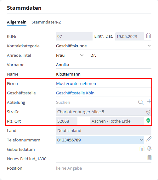 - Por favor, ten en cuenta que: Hay una derivación de la dirección postal de la oficina a la sección. A las sucursales se les aplica una lógica especial. Si la dirección postal de una persona física (cliente comercial) debe derivarse de la persona jurídica superior (empresa), esta regla se elude cuando una sucursal está vinculada como nivel intermedio, por ejemplo, entre una empresa y un cliente comercial. En el caso de los clientes empresariales, siempre se indica la dirección postal de la sucursal.
