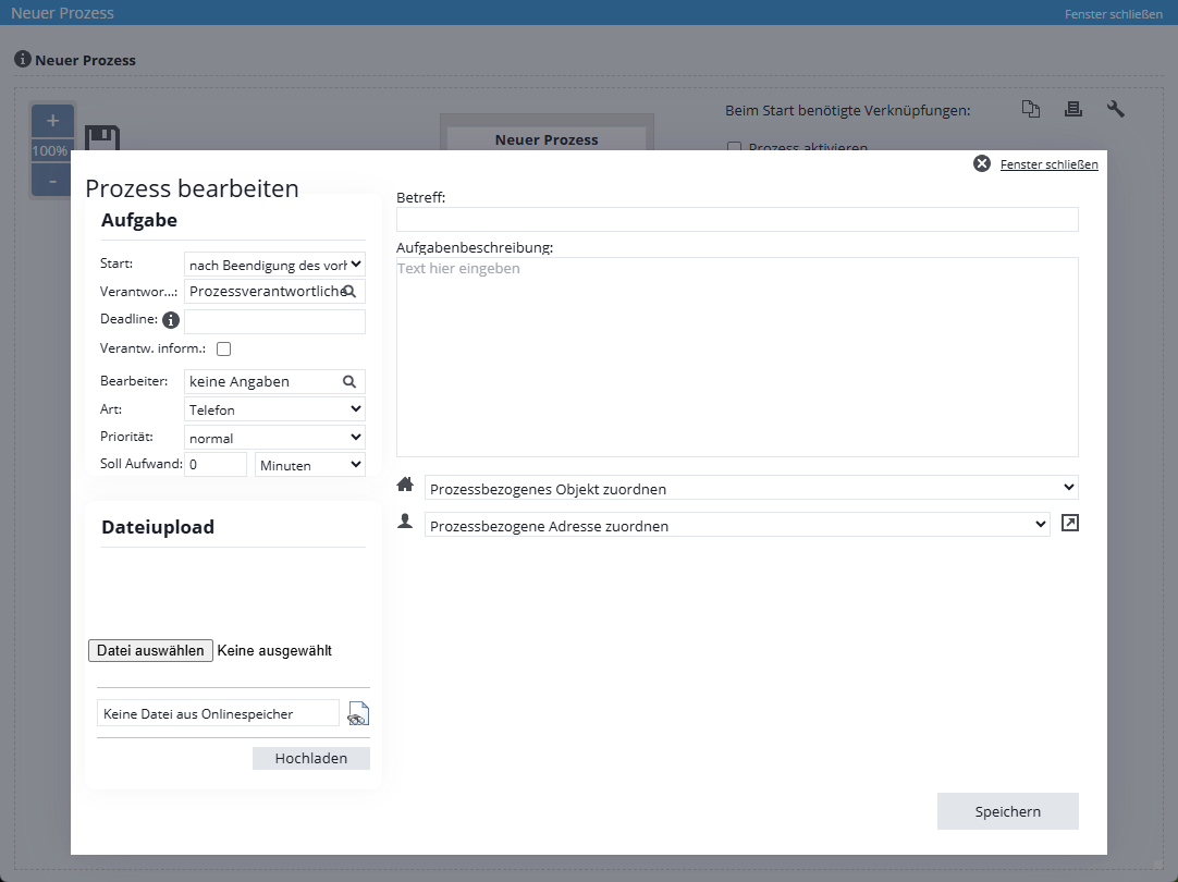 Über den Dateiupload laden Sie Dokumente, Bilder etc. hoch, die wichtig für diesen Prozessschritt sind. Diese werden dann an die erstellte Aufgabe angehängt.