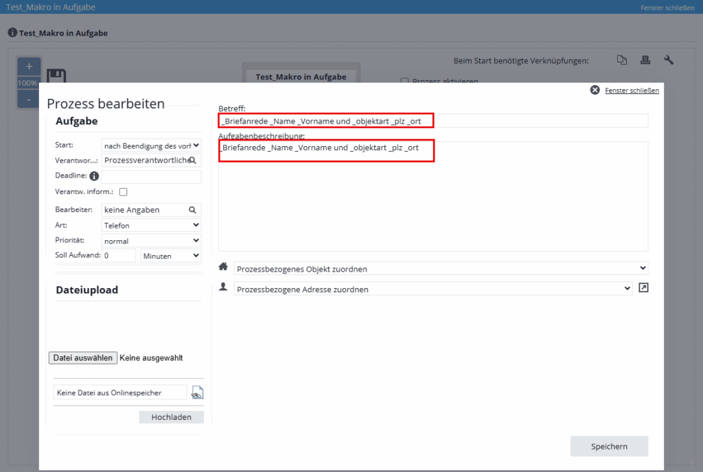Beim Ausführen dieses Schritts werden die Makros automatisch aufgelöst. Falls keine Adresse oder Immobilie verknüpft ist, werden die entsprechenden Makros „leer“ aufgelöst.