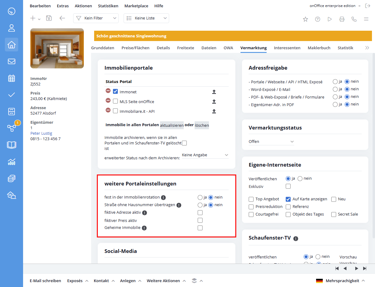 Si ciertas propiedades deben mostrarse siempre en el portal a pesar de la rotación de propiedades, debe excluirlas del cambio en la pestaña de Comercialización . Para ello, en la categoría «Otros ajustes de portales» establece la opción «fijo en la rotación de inmuebles» en «sí» . Con cada propiedad fija, la reserva para la selección aleatoria se reduce en un puesto.