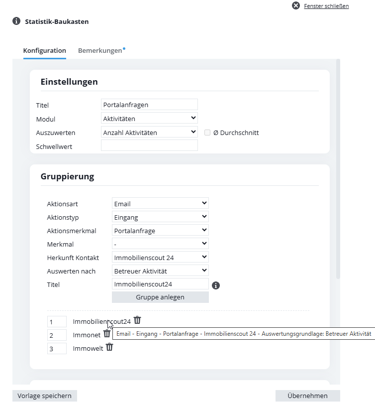 Hinweis: Filter werden in die Statistik kopiert. Änderungen im Filtereditor (Adress– oder Immobilienfilter) wirken sich nicht automatisch aus. Bei Anpassungen muss der Filter in der Statistik gelöscht und neu hinzugefügt werden.