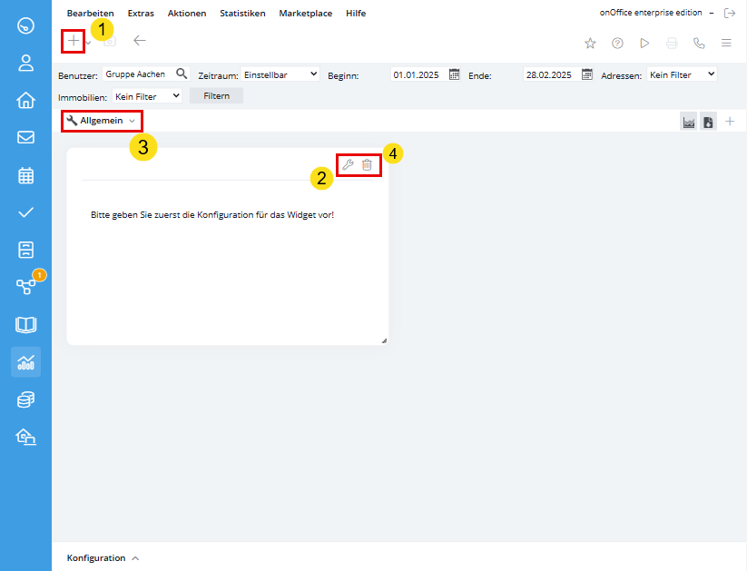 Sie können den Inhalt des leeren Basis-Widgets über das Schraubenschlüssel-Symbol (2) im Widget-Rahmen konfigurieren. Standardmäßig wird eine Immobilienstatistik mit zeitlichem Bezug angelegt.