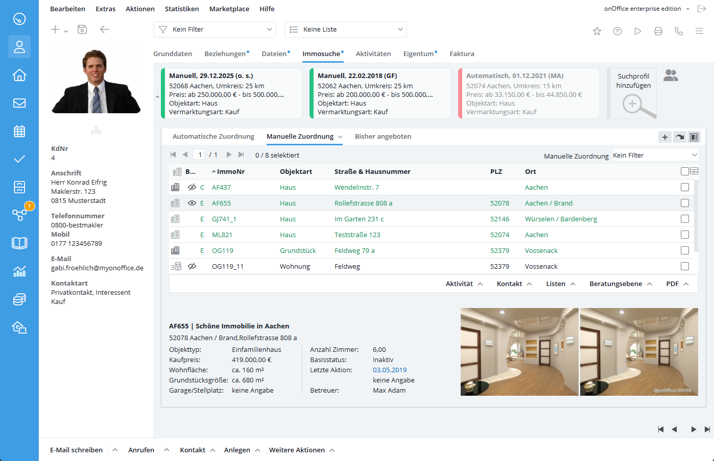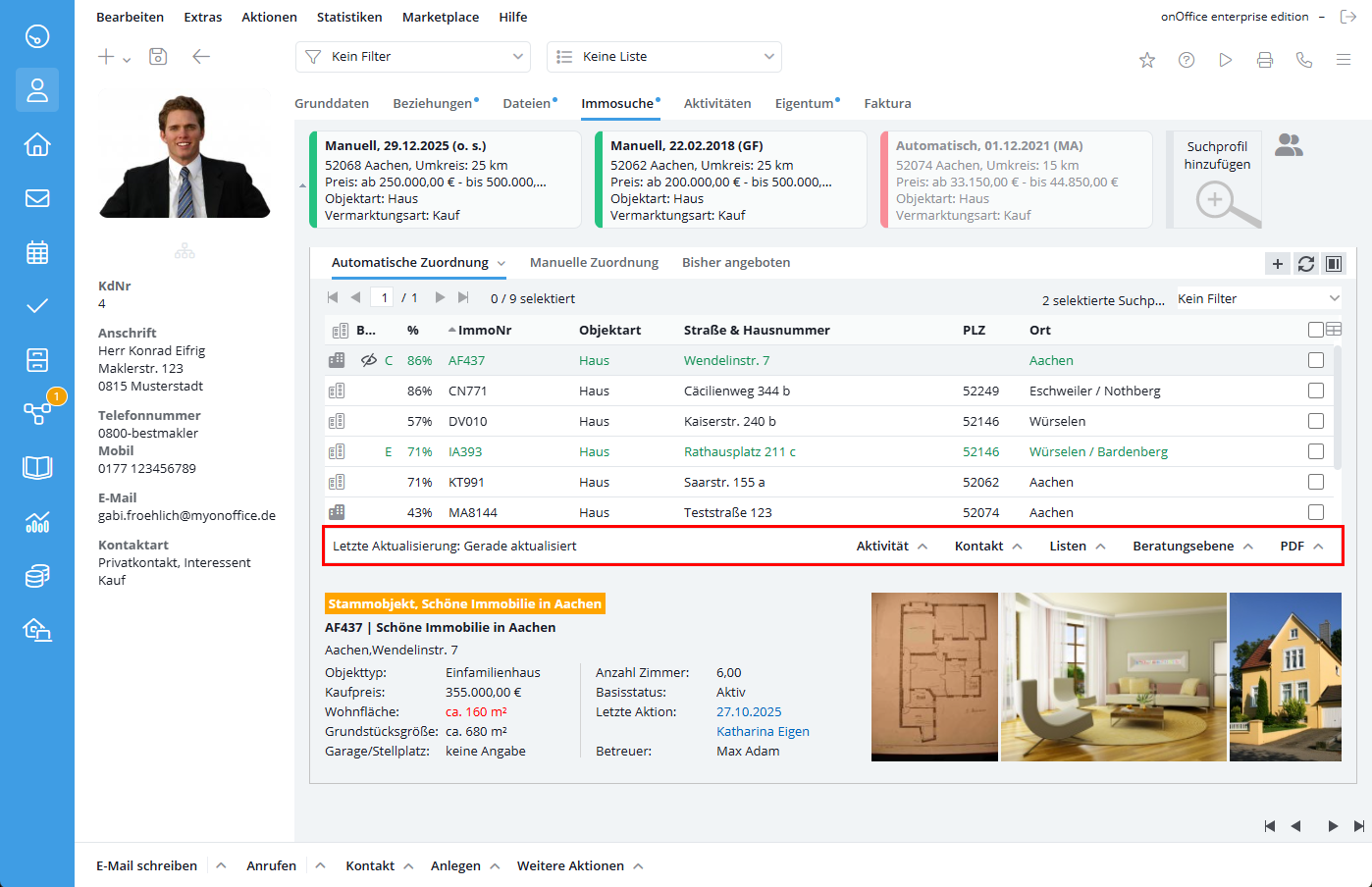 Los inmuebles con el contacto actual como propietario y sin estado de comercialización «abierto» no se muestran en la asignación automática.