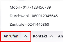 Puedes iniciar una llamada directamente desde la base de datos de contactos a través de Llamar. El requisito previo para ello es reservar y configurar el módulo telefónico. Utiliza el símbolo de flecha para seleccionar el número deseado – pulsa en Llamar para llamar al número predeterminado.