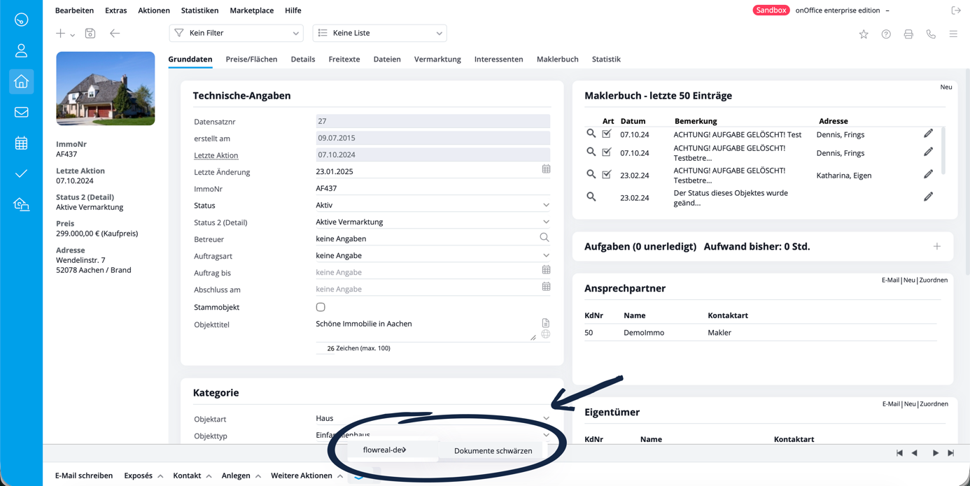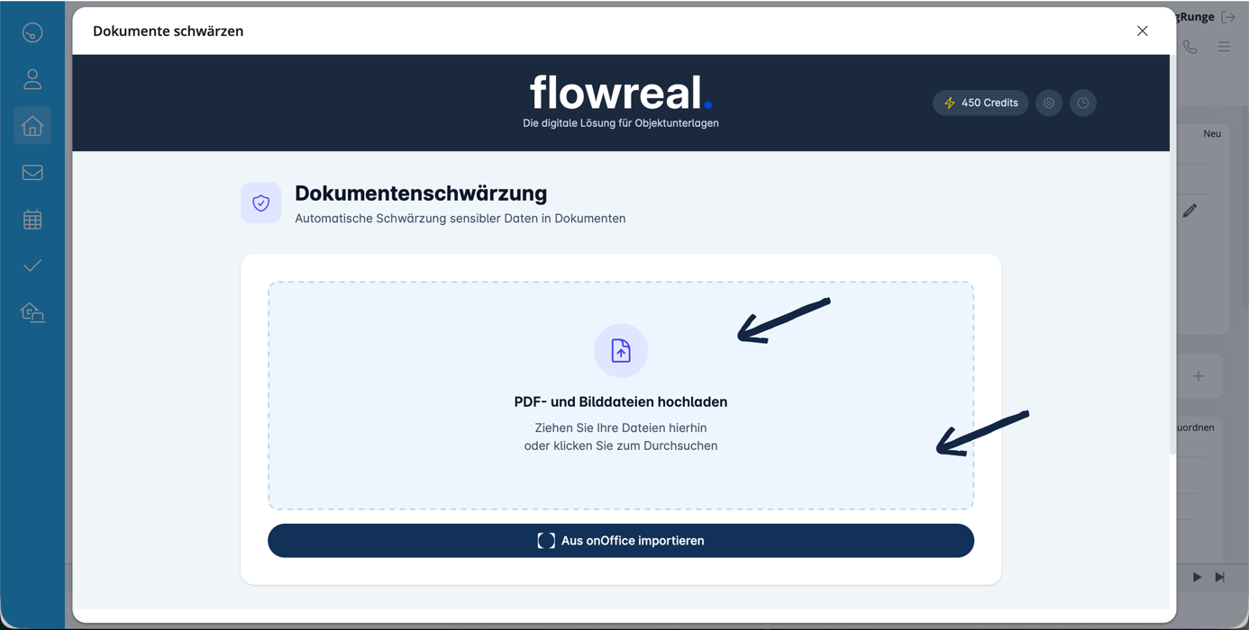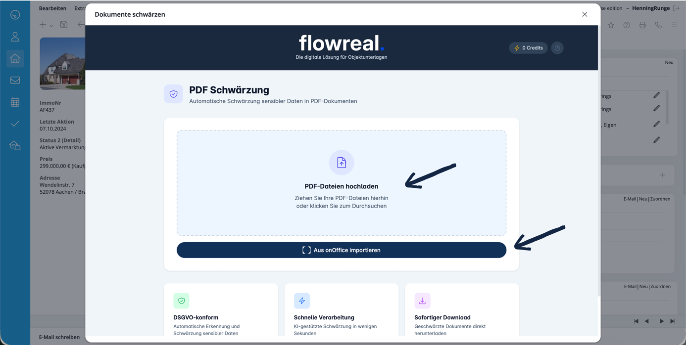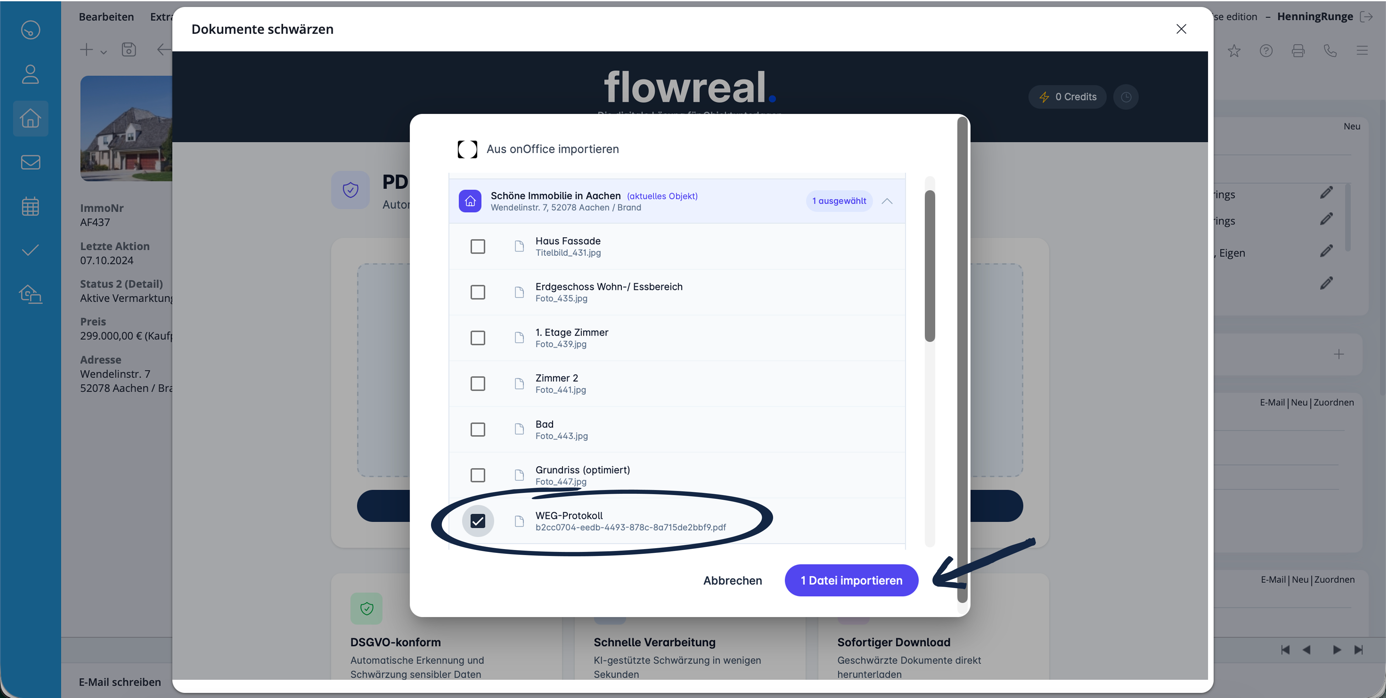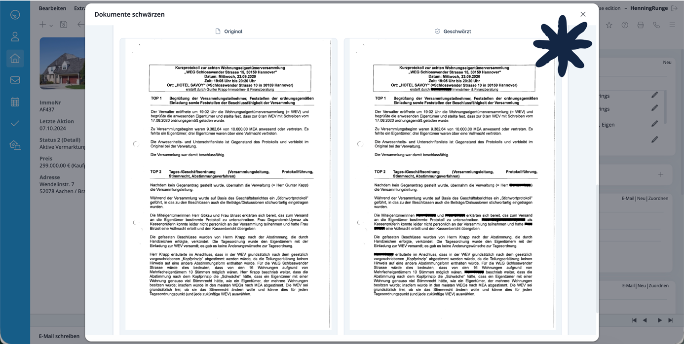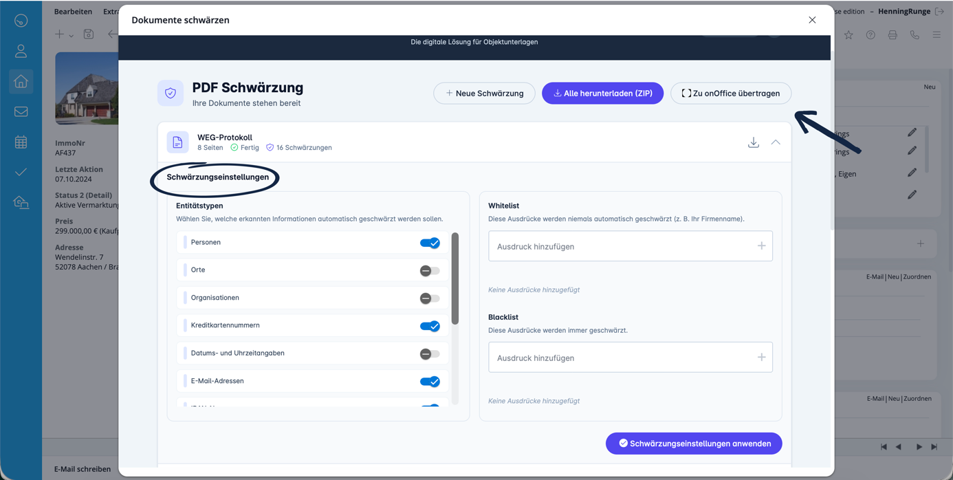 Letztlich übertragen Sie die geschwärzten Dokumente zurück in onOffice oder laden diese herunter.
