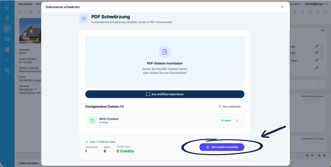 7. Führen Sie die automatische Schwärzung aus, indem Sie mit Ihren Credits bezahlen.