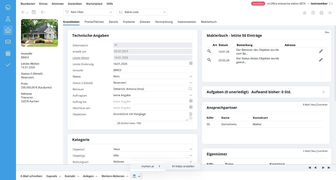 Nachdem „marton.ai“ aktiviert ist, können Sie direkt auf der Übersichtsseite eines Objekts ein KI-Immobilienvideo erstellen. Klicken sie dafür auf den Stapelbutton, dann auf „marton.ai“ und dann auf „KI-Video erstellen“.