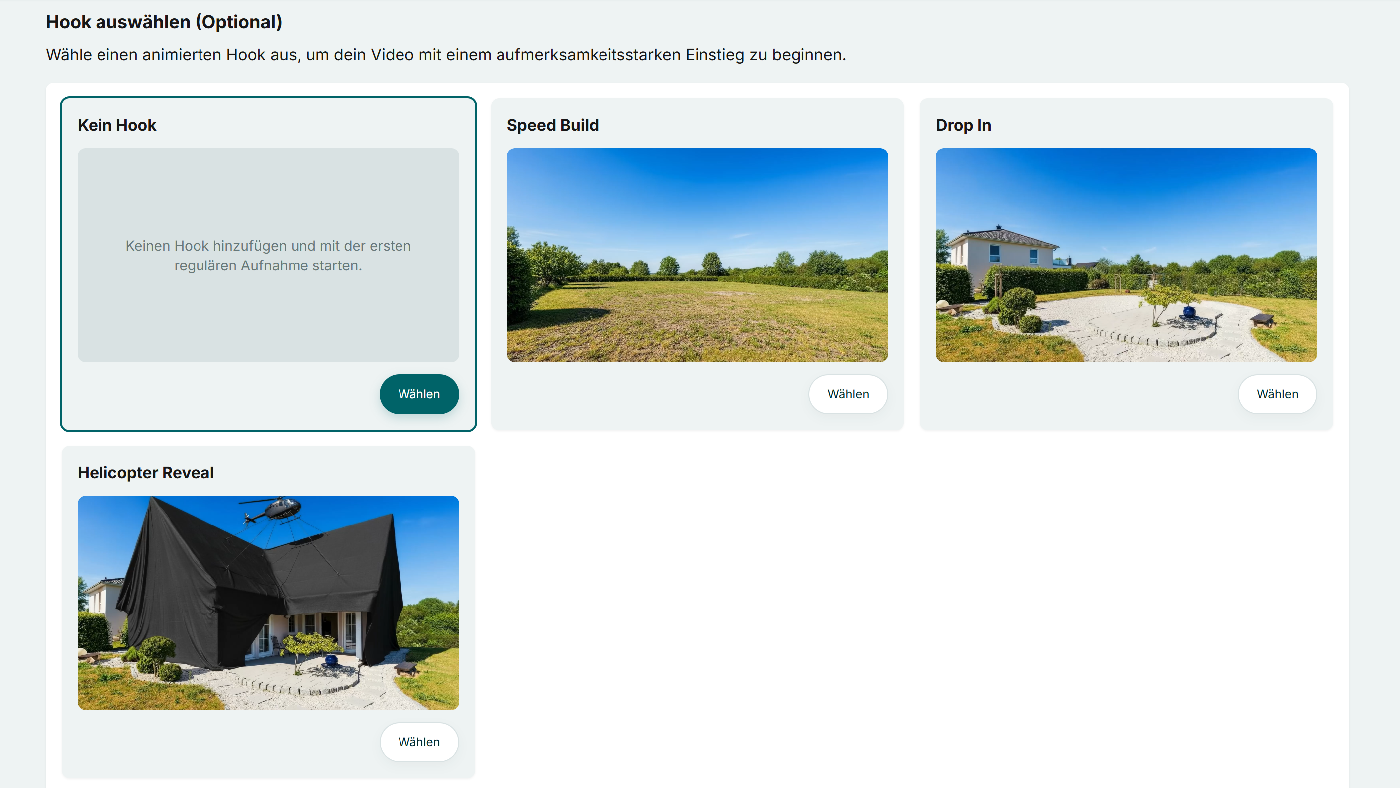 Wählen Sie aus, ob dem Video ein Hook hinzugefügt werden soll. Ein Hook ist der entscheidende Start eines Videos in den ersten 1-3 Sekunden, der die Aufmerksamkeit des Zuschauers sofort fesselt und ihn zum Weitersehen motiviert. Somit eignet sich der Hook ideal für Social Media.