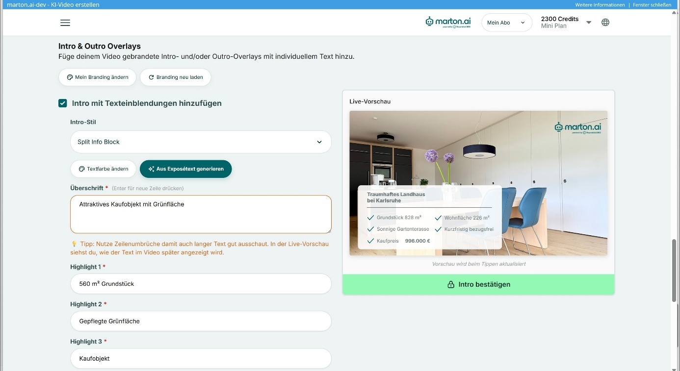 - Intro (Optional): Aktivieren Sie diese Option, um eine Start-Sequenz mit Text (z. B. „Exklusive Stadtvilla“) hinzuzufügen. Der Text wird automatisch aus Ihrem Exposé generiert und kann bei Bedarf angepasst werden. Das Design passt sich farblich automatisch Ihrem Branding an. Es kann aus verschiedenen Vorlagen gewählt werden.