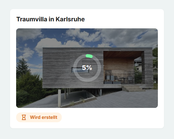 Verarbeitungsprozess: Das System analysiert nun die Bilder, berechnet Kamerafahrten und rendert das Video passend zur Musik. Dieser Vorgang dauert ca. 10 Minuten. Der Status im Dashboard wechselt nach Abschluss von „Wird erstellt“ auf „Bereit“. Anschließend können Sie das Projekt öffnen, das Ergebnis prüfen und im Video-Editor final bearbeiten.