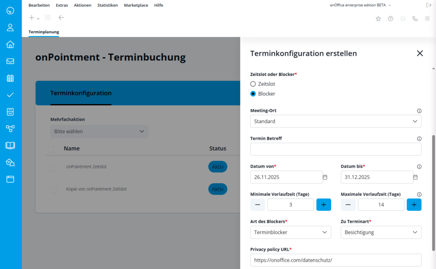 Navigieren Sie zu Ihrem Kalender. Im neuen Tab „Terminplanung“ erstellen Sie Ihre Konfiguration für die Terminbuchung. Füllen Sie dort alle wichtigen Daten aus und wählen Sie zwischen den Optionen „Zeitslot“ und „Blocker“.