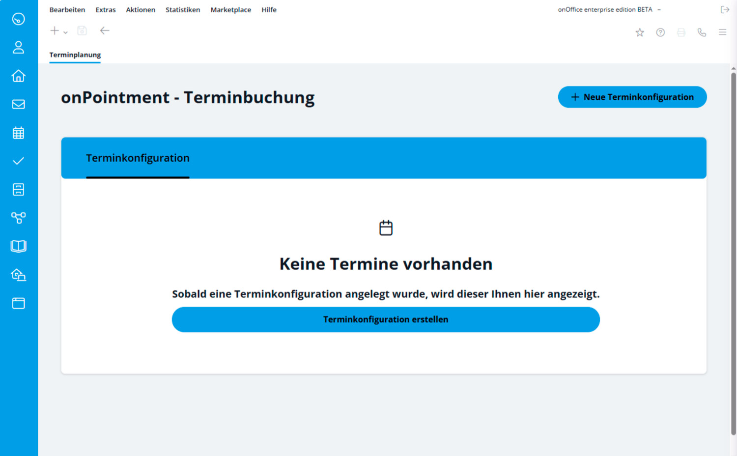Dies ist die Ansicht, wenn Sie onPointment zum ersten Mal öffnen und noch keine Konfiguration existiert. Über die Aktionsbuttons „Terminkonfiguration erstellen“ oder „Neue Terminkonfiguration“ legen Sie Ihre erste Terminkonfiguration an.