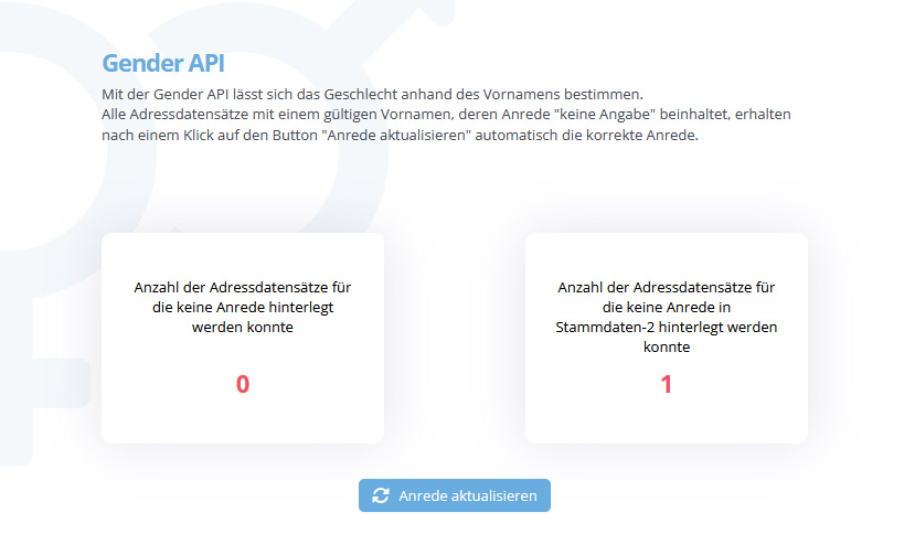 Mit Klick auf den Button „Anrede aktualisieren“ starten Sie den Vorgang und die Gender API ermittelt die passende Anrede.