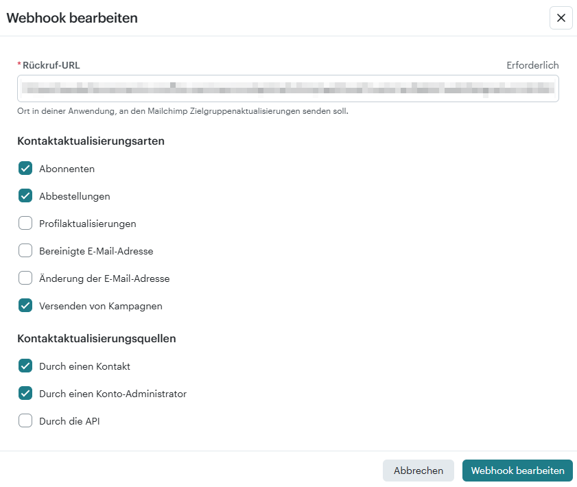 In Mailchimp finden Sie Ihre Webhooks unter Zielgruppe >> Weitere Optionen >> Zielgruppeneinstellungen >> Webhooks „Webhooks verwalten“ >> Button „Bearbeiten“. Es öffnet sich eine Lightbox mit allen Einstellungen.
