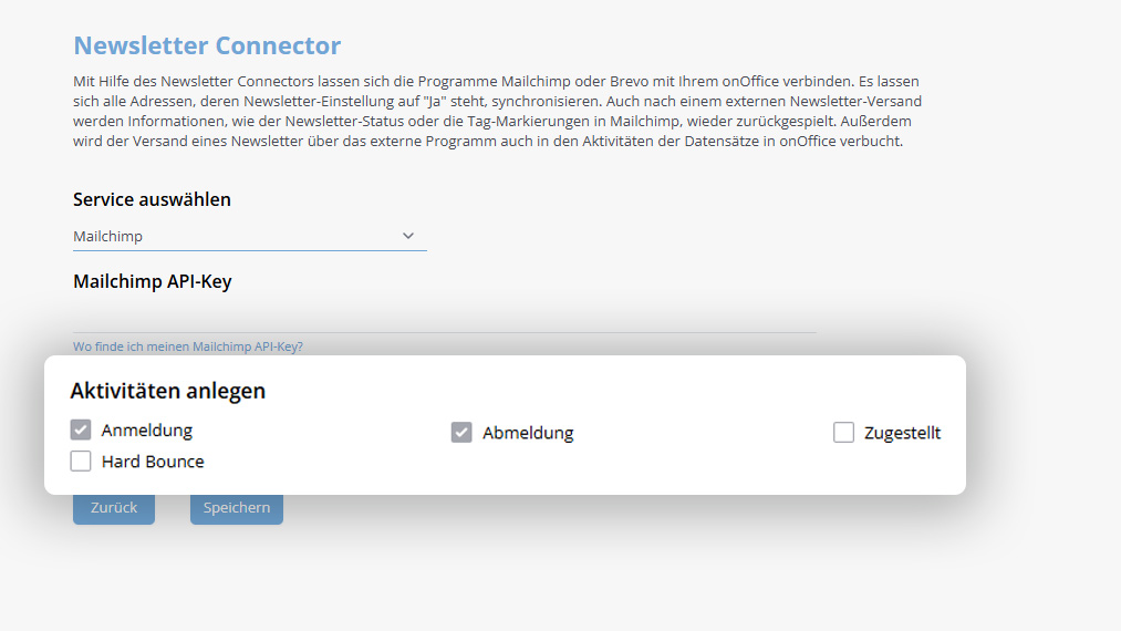 - Wählen Sie über die Checkboxen aus, für welche Aktionen in Ihren Datensätzen eine Aktivität angelegt werden soll. „Anmeldung“ und „Abmeldung“ sind vorausgewählt und können nicht abgewählt werden. Zusätzlich gibt es für Mailchimp die Optionen „Zugestellt“ und „Hard Bounce“.